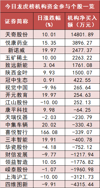 盘后龙虎榜数据显示,机构现身21股,其中天奇股份等10股呈现机构资金净买入,四维图新等11股呈现机构资金净卖出。