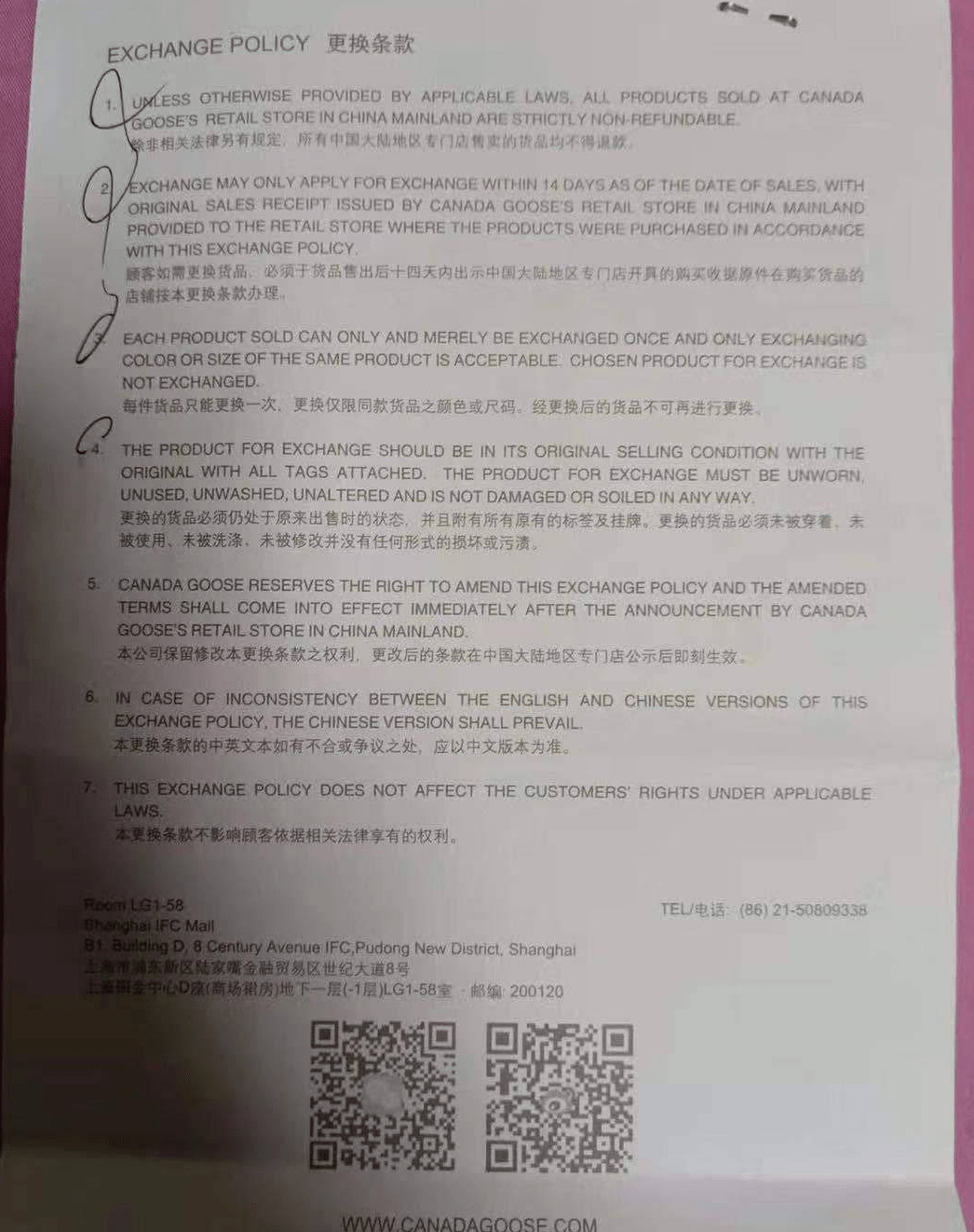 此前据媒体报道,10月27日,上海的贾女士在国金中心商场“加拿大鹅”专门店,购买了一件价格上万的羽绒服。贾女士称回家后发现衣服的商标绣错了,中心太阳处多绣了一根弧线,并且缝线粗糙、面料刺鼻,但是贾女士表示购衣时曾被店员要求签署“更换条款”,条款显示除非相关法律另有规定,所有中国大陆地区专门店售卖的货品均不得退货。而在加拿大鹅官方网站搜索时发现,其在加拿大、美国、英国地区均有30天退货政策。