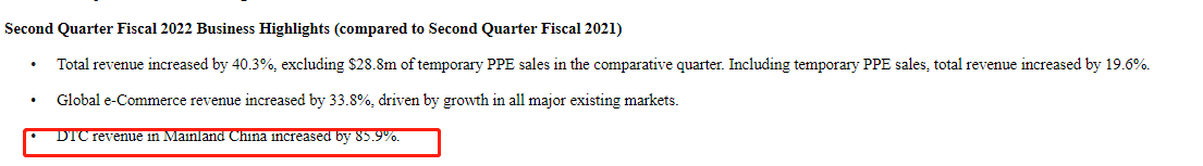 其中,二季度加拿大鹅电子商务营收同比增长33.8%;大中华区的直营渠道销售额同比增长85.9%。