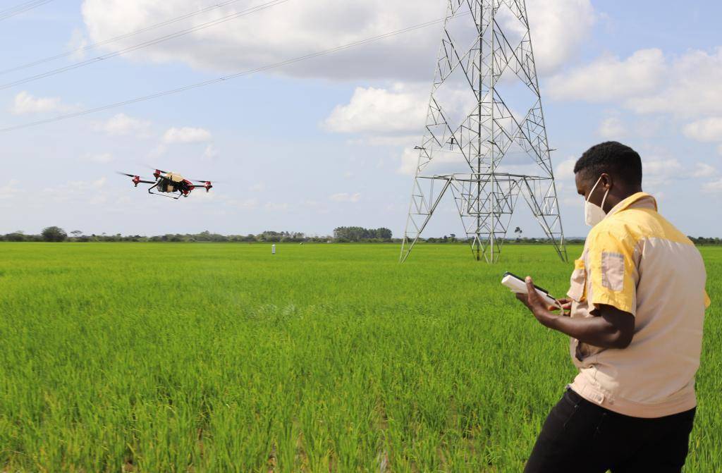 6月2日,在乌干达卡隆古区卢卡亚镇中亿农业园,作业员赫伯特阿加巴操控植保无人机喷洒农药。新华社记者张改萍摄