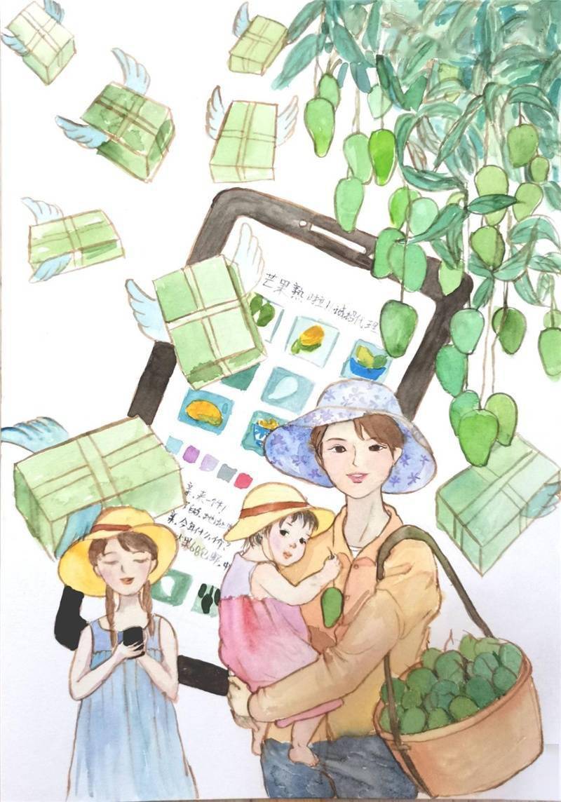 画作《我和妈妈卖芒果》,画面中的一个妇女肩上背着装满芒果的篮子,手上抱着一名幼童,小女孩通过手机发布买芒果的广告信息,一个个芒果快递插上电商的翅膀飞往全国各地。作者黄秋园介绍:“作品表现了农村妇女利用先进的互联网技术和发达的物流行业,实现足不出户就把自家的芒果销往全国各地,走出了一条新的乡村发展之路。”