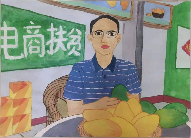 画作《携知识返乡,架电商金桥》的主人公叫岑参,是一位毕业于中山大学信息系统专业的“80后”青年。十年前,他不顾家人反对,毅然辞去高薪工作,从广州返乡创办了广西田东农派三叔商务公司。他决定利用自己的网络技术专长,将田东芒果、火龙果、百香果等特色农产品销往全国。短短几年,岑参的公司已经与1000多户农户合作,年销售优质百色芒果超过300万斤。