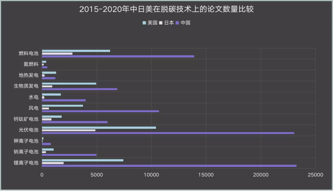 中国在脱碳技术方面的论文数量在9成领域占据世界第一,除了锂电池外,钠离子电池、钾离子电池等新型电池的论文数量都是日本的十多倍。