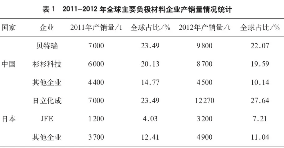2012年,全球出货量排名前十的企业中,中国企业只有贝特瑞、杉杉两家,日本巨头日立化成、日本碳素、JFE居于前三。