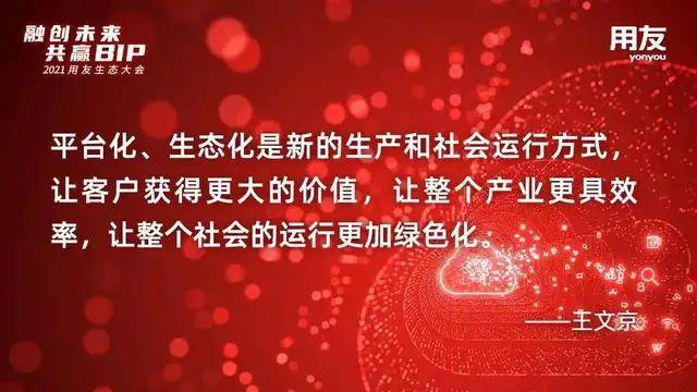 用友网络董事长兼CEO王文京在公开演讲中表示,平台化、生态化是新的生产和社会运行方式,用友通过构建和运行商业创新平台——用友BIP,让客户获得更大的价值,让整个产业更具效率,让整个社会的运行更加绿色化。
