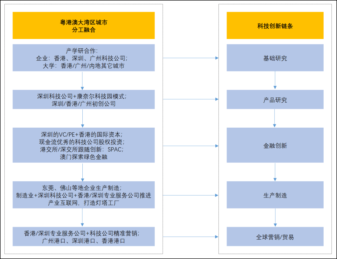 一个完整的科技创新链条包括“基础研究→产品研究→金融创新→生产制造→全球营销/贸易”5个阶段,每个阶段粤港澳大湾区城市群,都有相应的禀赋、策略及科技公司的能力 (每个阶段都存在影响力) 对接上。