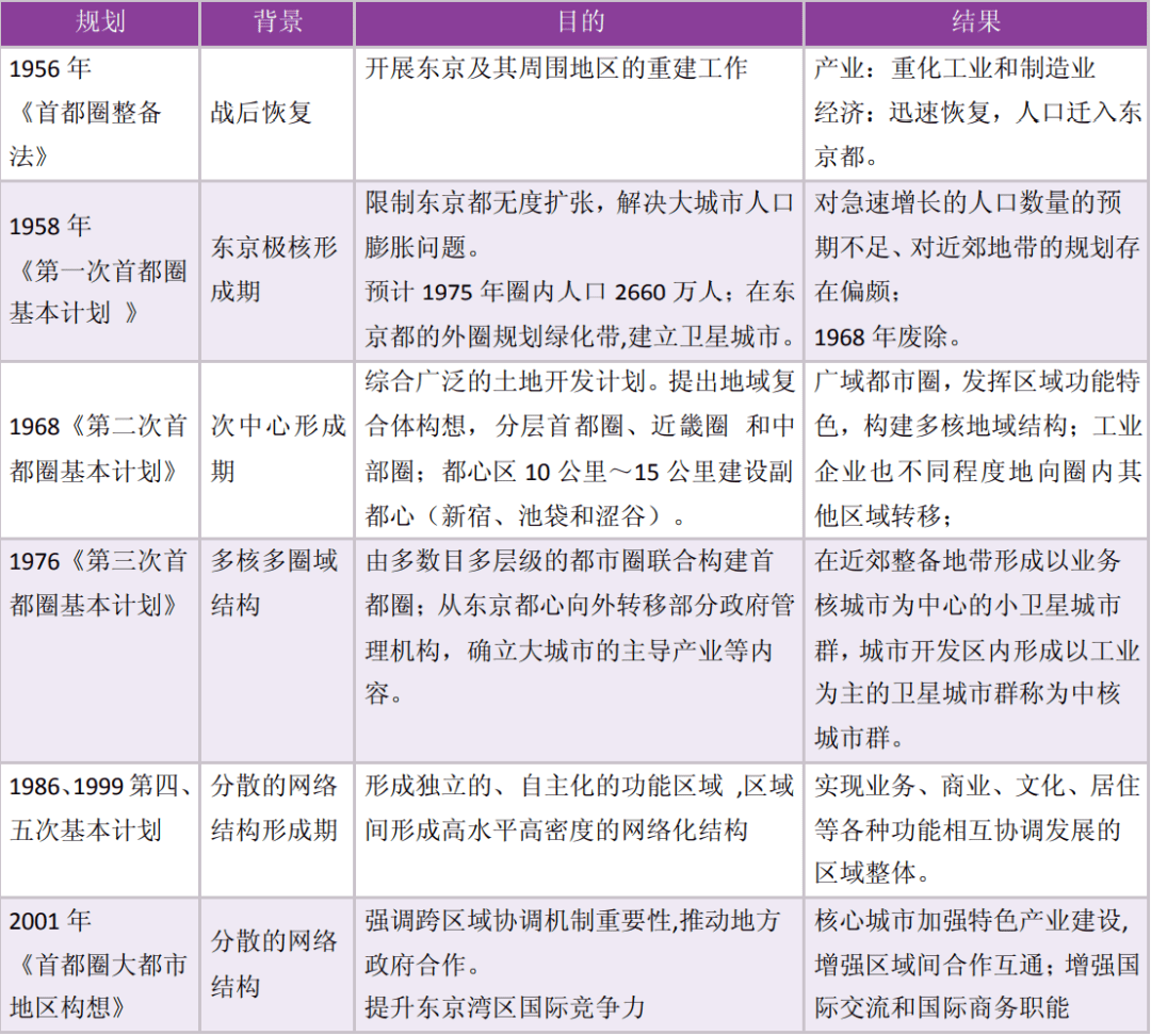 东京湾区的规划更加系统,共经历——战后首都圈整备计划、五次全国综合开发规划、五次首都圈基本规划以及首都圈大都市地区构想。这些规划为东京湾区互通互联的实现、圈内城市功能定位和未来发展方向提供了全局指导。