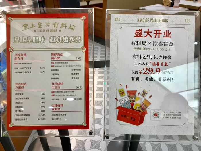 这家店位于广州IFC国金天地负一层,除主打的腊味煲仔饭外,还提供广式烧卤、西式肉料等系列菜品,腊肉、腊鸭、烧肉、鸭肝肠、鱼干、花腩肉等均来自皇上皇自家产品。目前,门店套餐价在38-59元不等。