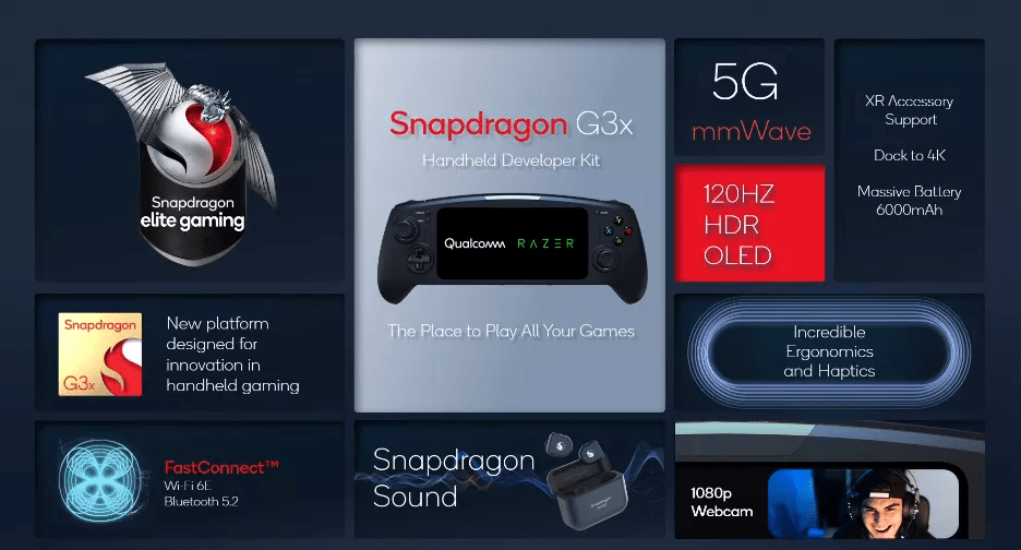 基于骁龙 G3x 游戏平台打造的手持游戏专用设备开发套件在显示、性能、直播、连接、人体工学和 Snapdragon Sound 骁龙畅听等多个方面为开发者提供高端图形性能和无处不在的连接,实现绝佳性能。