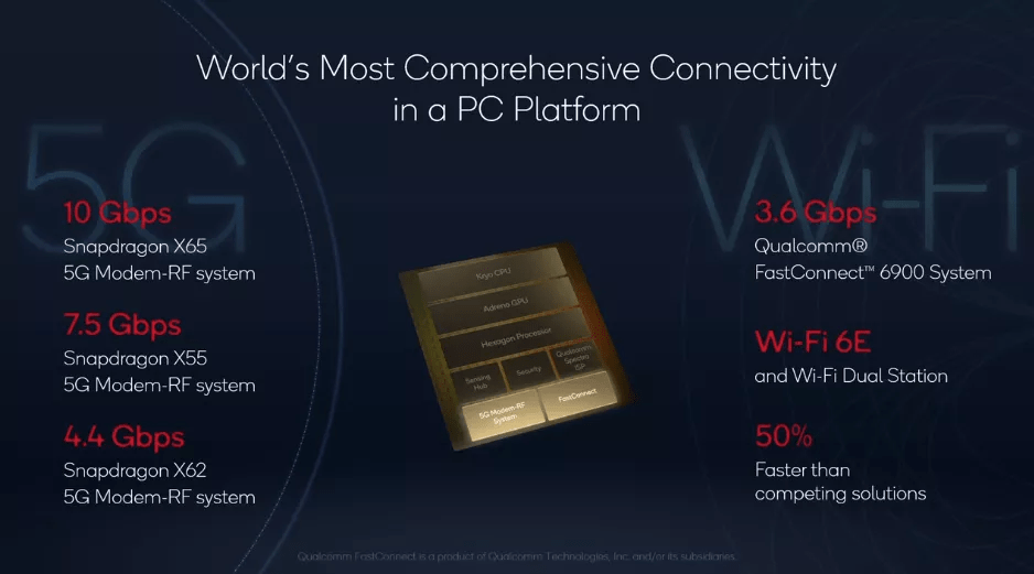 在连接能力方面,凭借对骁龙 X55、X62 或 X65 5G 调制解调器及射频系统的支持,搭载 8cx 计算平台的终端能够实现最高达 10Gbps 的超快连接速度。8cx 计算平台还采用了高通 FastConnect 6900 移动连接系统,结合双 Wi-Fi 客户端能够实现目前商用的最快 Wi-Fi 6/6E 速率。搭载该平台的产品可在 Wi-Fi 6 和 Wi-Fi 6E、5G 或 4G LTE 可信网络之间无缝切换。