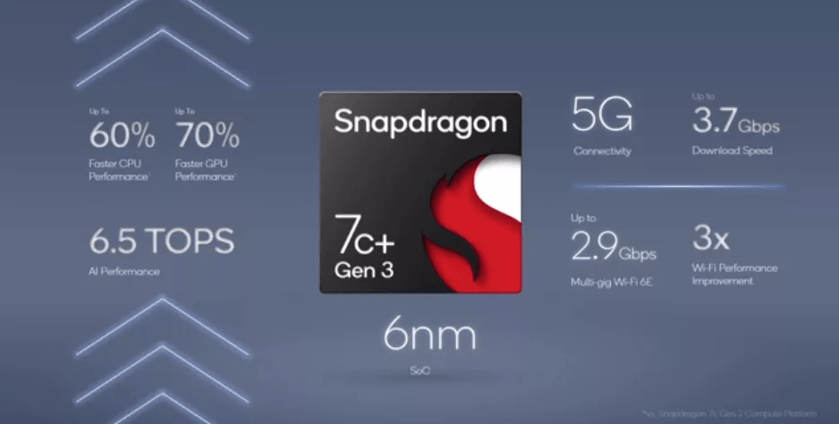 - 采用 6 纳米工艺制程的第 3 代骁龙 7c + 计算平台,专为 Windows PC 和 Chromebook 生态系统的用户打造,与前代平台相比,CPU 性能提升高达 60%、图形处理性能提升高达 70%;