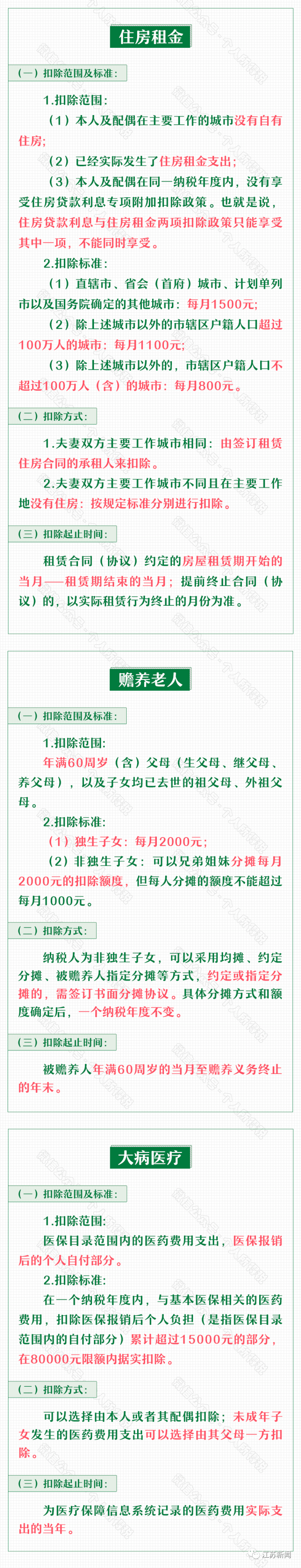 目前,纳税人可以享受子女教育、继续教育、大病医疗、住房贷款利息、住房租金、赡养老人等6类专项附加扣除!