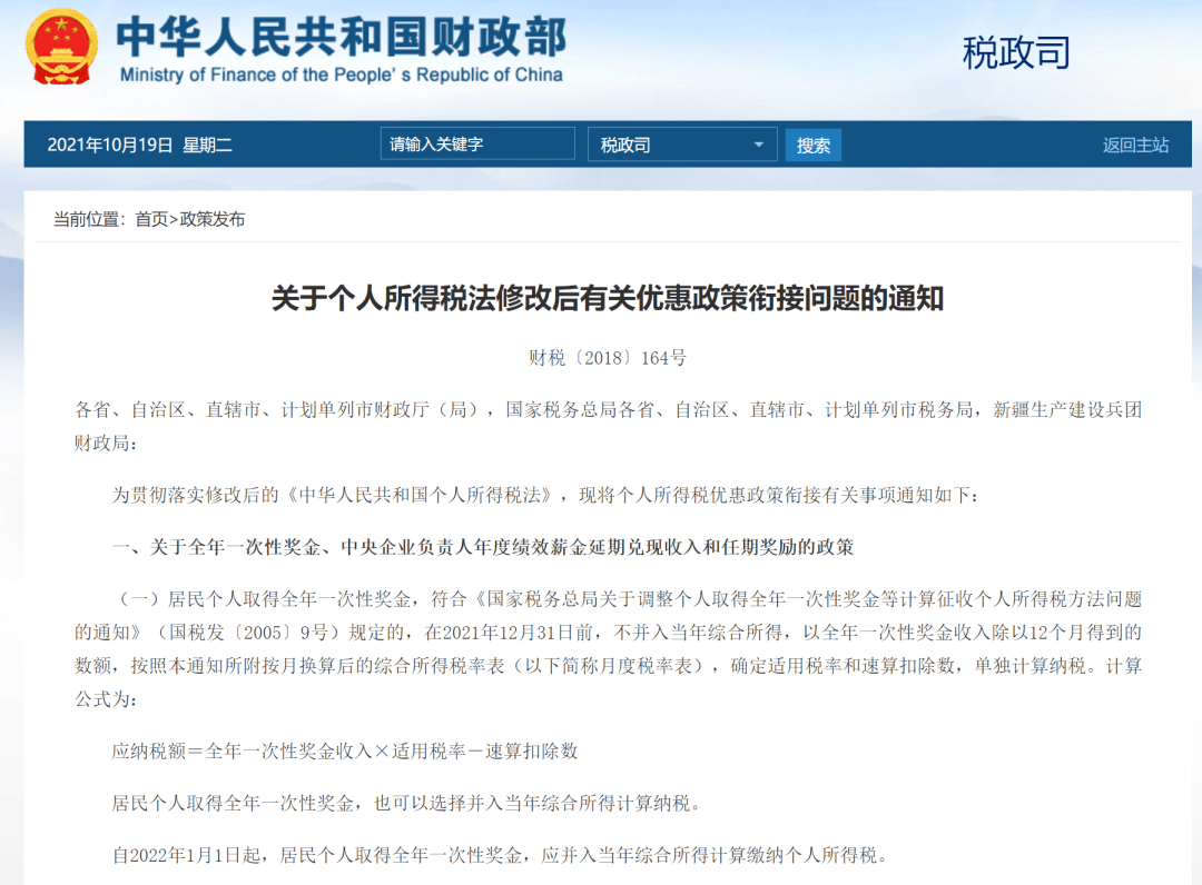 根据财政部、税务总局如下规定,居民个人取得全年一次性奖金,符合国家规定的,在2021年12月31日前,不并入当年综合所得,以全年一次性奖金收入除以12个月得到的数额,按照本通知所附按月换算后的综合所得税率表,确定适用税率和速算扣除数,单独计算纳税。