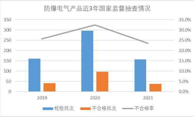中国经济网北京12月2日讯 近日,市场监管总局通报了2021年家用燃气用具和防爆电气产品质量国家监督抽查情况,其中,防爆电气产品抽查结果分析显示,本次抽查了158家企业生产的159批次防爆电气产品,涉及防爆灯具、防爆电机、防爆电器3种产品,检验157批次,发现37批次产品不合格,不合格发现率为23.6%,其中防爆灯具和防爆电机的不合格发现率均超过25%。该类产品自2019年至2021年,整体不合格发现率为25.6%、32.4%、23.6%。