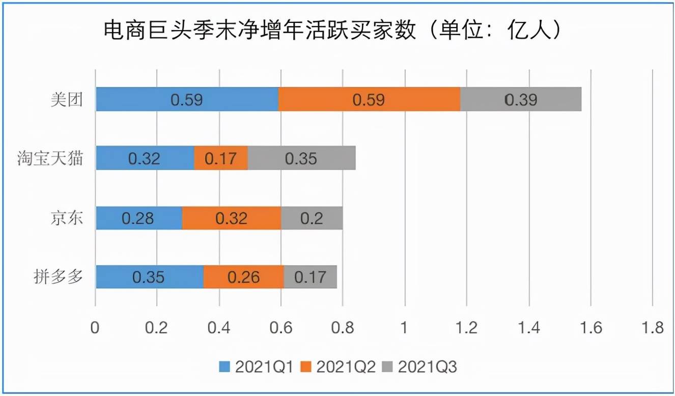 今年前三季度,阿里、京东、美团都在拓展用户,增长可观。相比这三家公司,拼多多今年前三季度新增年活跃买家数量最少。