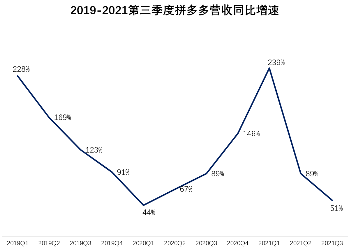 财报显示,拼多多第三季度营收215.1亿元,同比增长51%,环比下降6.68%,不及市场预期的267亿元。此前,拼多多2021年第二季度的营收同比增速为89%,2021年第一季度的营收同比增速为239%,增速连续两个季度放缓。