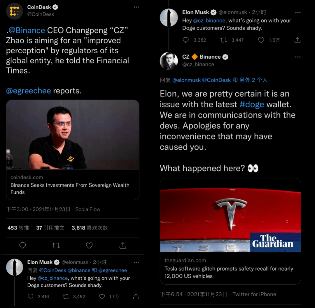 11月23日,因不满币安暂停了狗狗币的提现,马斯克推特评论并且艾特赵长鹏,质疑其“币安”对狗狗币用户做了什么?