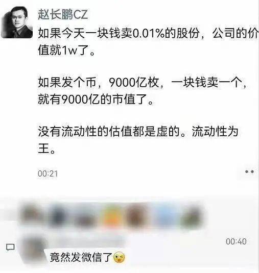 就在币圈为之震惊欢呼的时候,赵长鹏却在凌晨十二点半的朋友圈发文称:“如果今天一块钱卖0.01%的股份,公司的价值就1w了。如果发个betway手机登录币,9000亿枚,一块钱卖一个,就有9000亿的市值了”, 表示“没有流动性的估值都是虚的。流动性为王”。