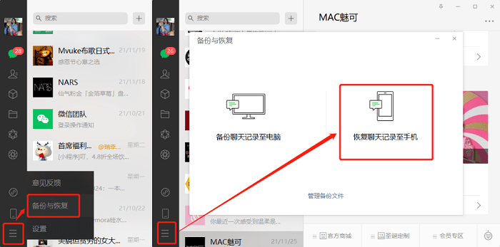 操作方法:在确保手机与电脑连接同一个网络的情况下,打开电脑端的微信,打开【设置】图标-【备份与恢复】-【恢复聊天记录至手机】。等待恢复即可。