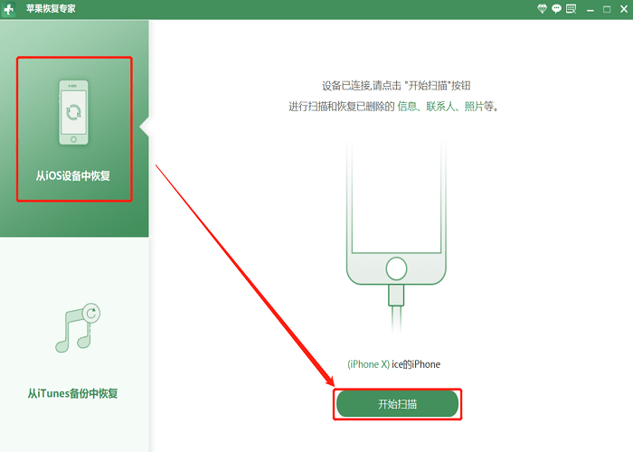 第一步、电脑与手机连接好后,运行苹果恢复专家,选择【从iOS设备中恢复】,之后点击下方的【开始扫描】。