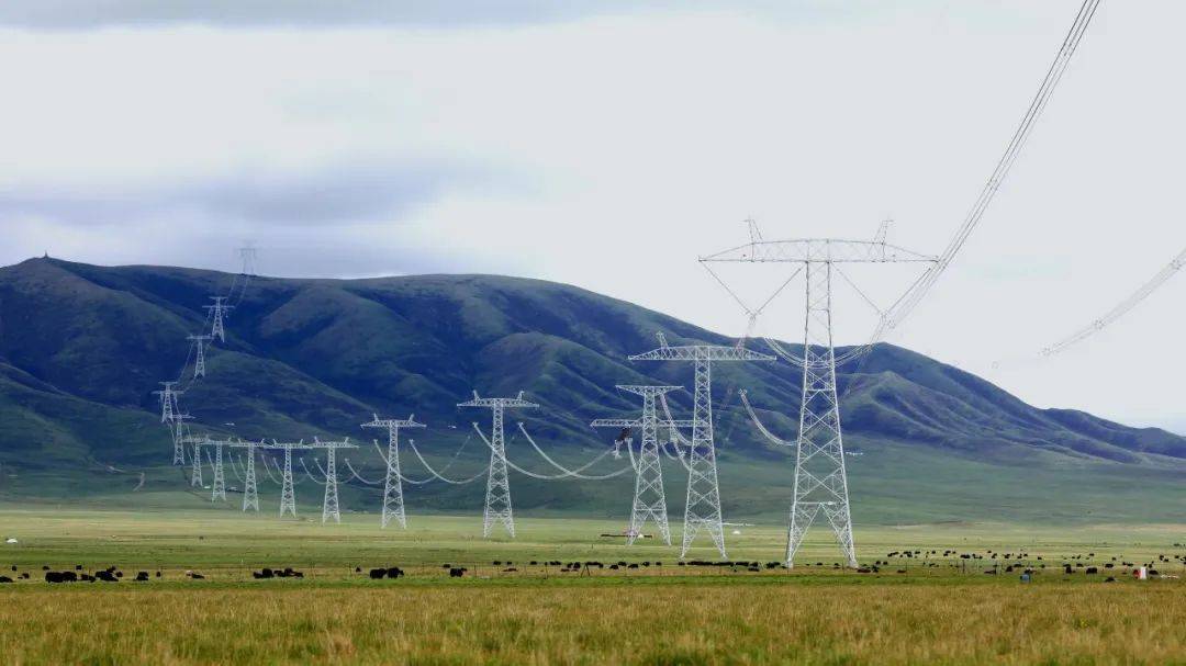 在青海省黄南藏族自治州河南蒙古族自治县拍摄的青豫特高压直流工程。谢莉蓉摄(新华社)