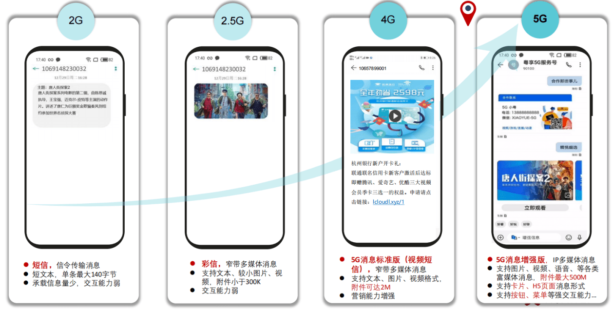 视频短信:可以发送最大2M的多媒体信息,可发送视频、图片、音频、文字,短信内容中可附带链接,都需要经过签名报备、模板审核,无需预装终端SDK、APP,全面覆盖现存市面主流智能手机,安卓、IOS系统均可展示。视频短信业务可覆盖短信主流业务场景,同时提升用户发送体验和企业宣传效果。