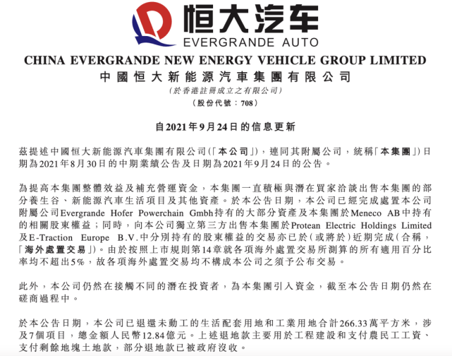 此外,为提高集团整体效益及补充营运资金,恒大汽车一直积极与潜在买家洽谈出售集团的部分养生谷、新能源汽车生活项目及其他资产。本公司仍然在接触不同的潜在投资者,为本集团引入资金,截止本公告日期仍在磋商过程中。