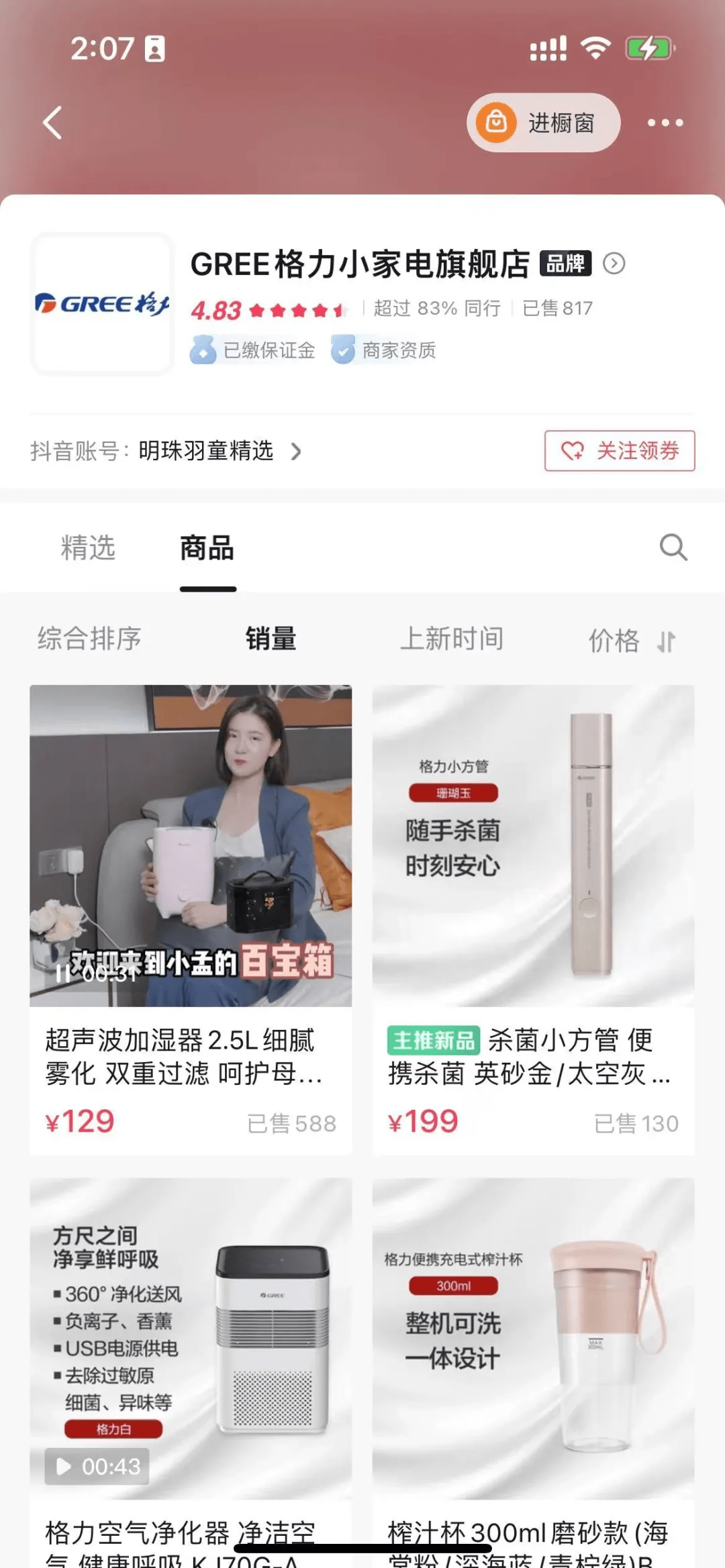 在孟羽童被推到台前之后,吃尽流量红利,“明珠羽童精选”账号6天涨粉10万,但目前的销量却十分惨淡。在该账号的视频中,孟羽童介绍的产品都会附上“GREE格力小家电旗舰店”的链接,该店铺目前已上线了52款产品,均以格力小家电为主。