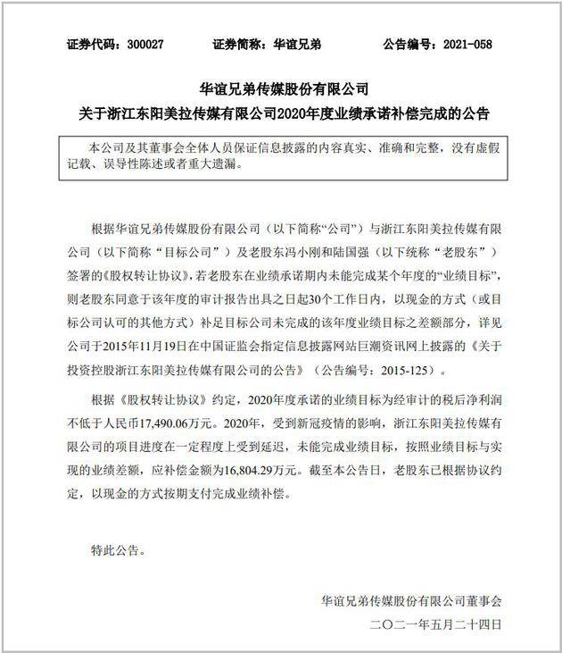 根据《股权转让协议》约定,2020年承诺的业绩目标为经审计的税后净利润不降低人民币17490.06万元。2020年,受到新冠疫情的影响,浙江东阳美拉传媒有限公司的项目进度延迟了金宝搏平台黑钱,重新完成业绩目标,按照业绩目标与实现的业绩差额,应补偿金额为16804.29万元。