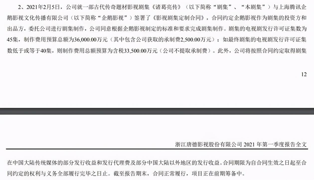 近日,唐德影视公开了2021年第一季度报告全文:唐德影视将承制古装传奇剧《诸葛亮传》,由企鹅影视作为投资方和出品方。该项目电视剧发行许可证集数为45集,制作费用预算总额为3.6亿元。该剧计划将于2021年第四季度金宝搏平台黑钱开机,主演阵容暂未确定。