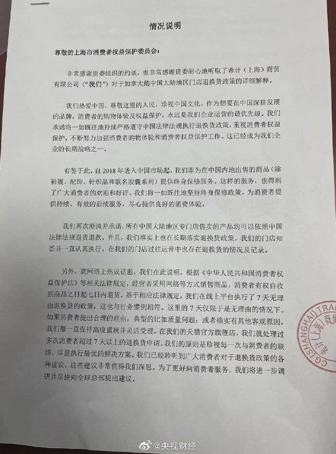 针对《情况说明》,上海市消保委副秘书长唐健盛认为,此份说明只是介绍7天无理由退换货政策,为何不能按照加拿大鹅在别的国家30天退货政策?加拿大鹅公司人员表示回去告知公司。