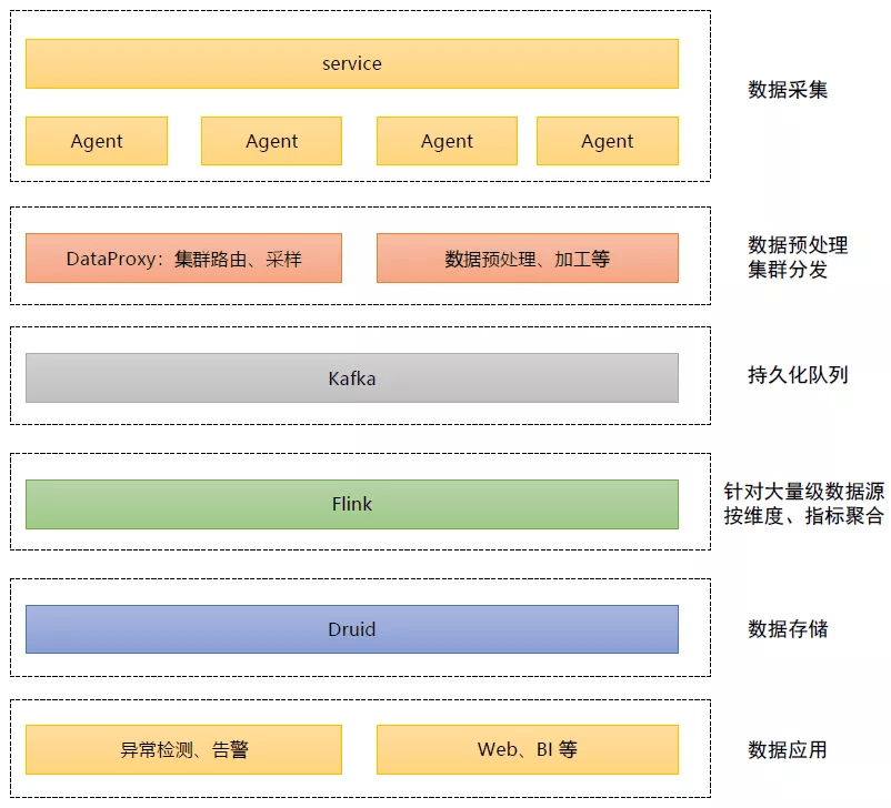 业务通过共享内存,把数据写入共享内存中,然后 Agent 会一直轮询这个共享内存的数据,再异步推给中控的 Proxy ,由它进行采样、路由的操作。同时会在预处理层进行数据的预处理、加工等,把预处理后的数据发给持久化的 Kafka 队列。Kafka 队列中一小部分数据会被 Druid 直接消费。大部分的数据,会通过 Flink 进行预聚合,Flink 会以每6秒的粒度把明细数据进行聚合,然后重新写回 Kafka 供 Druid 消费。Druid 的数据通过数据层把它的数据查询出来,提供给 Web,后续提供给异常检测做告警处理。