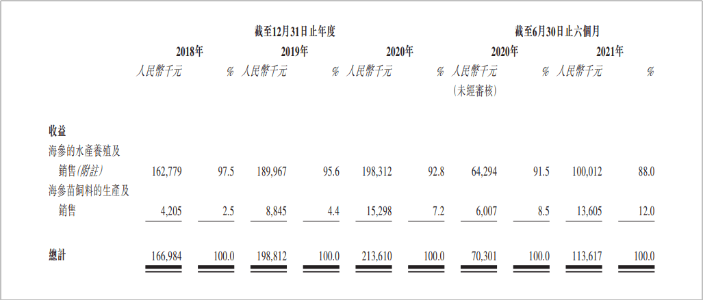 在收入方面,主要来自于海参及海参饲料的销售,总收入由2018财年的约人民币1.67亿元增加19.0%至2019财年的约人民币1.99亿元。由2019财年的约人民币1.99亿元增加7.4%至2020财年的约人民币2.14亿元。由2020年上半年的约人民币0.70亿元增加61.6%至2021年上半年的约人民币1.14亿元。显着增长主要由于期间幼参及海参苗饲料的需求不断增长。
