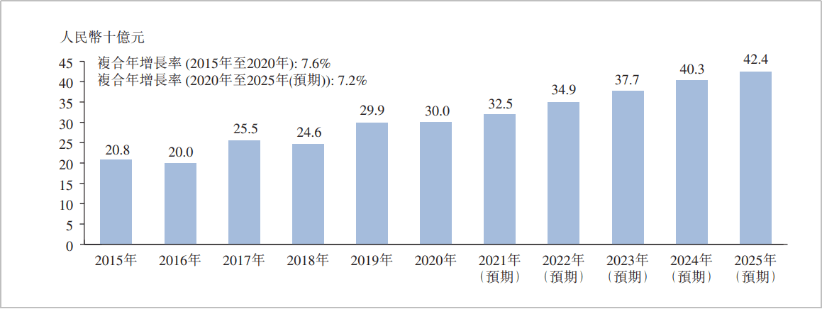 海参养殖业的产值从2015年的约人民币208亿元增至2020年的约人民币300亿元,复合年增长率约为7.6%。预计在未来五年中,由于消费者购买力日益提高,消费者群体扩大及消费升级,海参养殖业将继续增长。在消费升级及标准化行业法规的推动下,预计海参养殖的产值将从2020年的人民币300亿元增至2025年的人民币424亿元,复合年增长率约为 7.2%