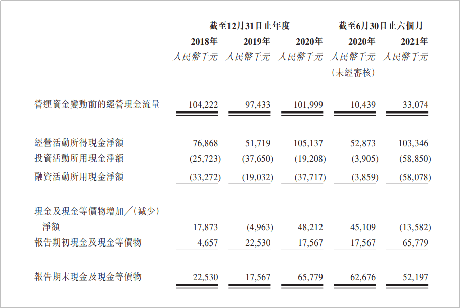 在现金流方面,2018年、2019年及2020年以及2021年6月30日,现金及现金等价物分别约为人民币22,530,000元、人民币17,567,000元、人民币65,779,000元及人民币52,197,000元。经营活动所得现金流入主要来自产品销售,经营活动的现金流出主要是购买海参养殖的原材料及支付员工成本。