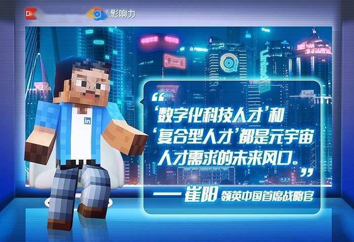 除此之外,元宇宙还有许多未知的岗位诞生。近日,围绕元宇宙的相关话题,由领英发起的《影响力》栏目特意利用Minecraft平台,打造了一个赛博朋克风的虚拟圆桌论坛,来自行业各界的五位嘉宾均以虚拟人的形象出现,而这也是对元宇宙时代论坛方式的简单模拟。