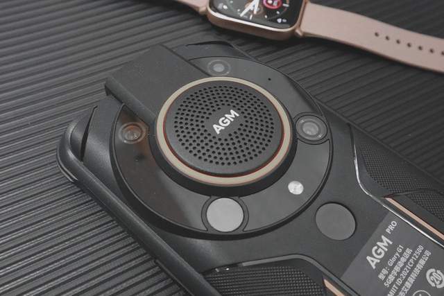 AGM G1 Pro背部有个巨大的扬声器,单纯测试了一下AGM G1 Pro的音量,在嘈杂的工地是绝对可以听清楚的。扬声器四周有个圆环汇集了4800像素主摄、200万像素微距、2000万像素夜视、热成像、闪光灯、气压孔、夜视补光灯一系列功能元件。AGM G1 Pro的主摄也有4800万,拍照还是很不错的。