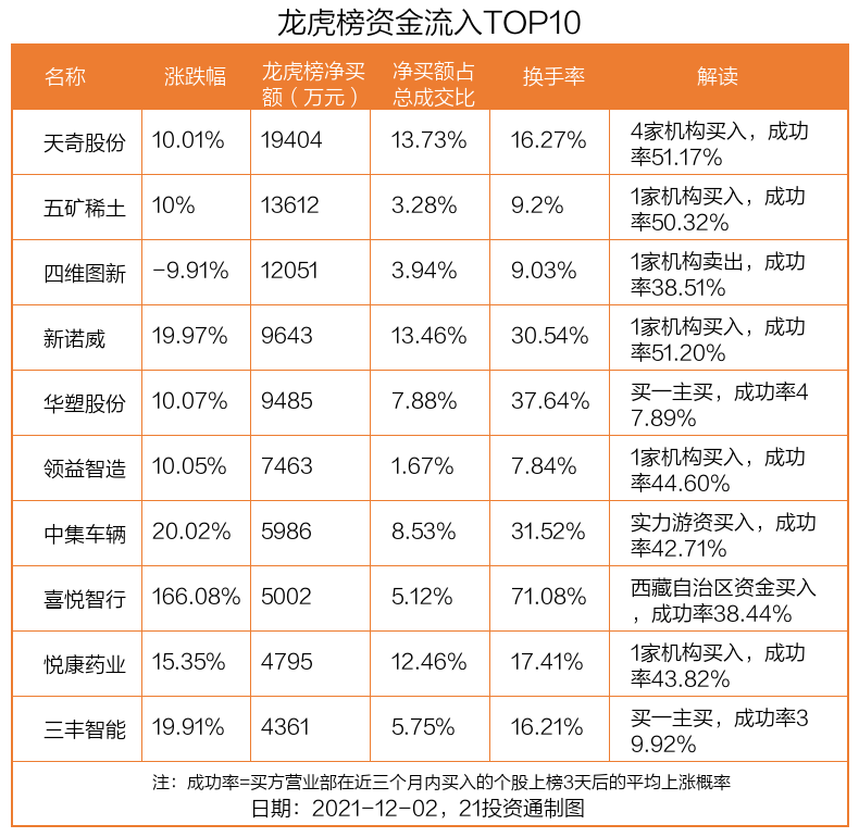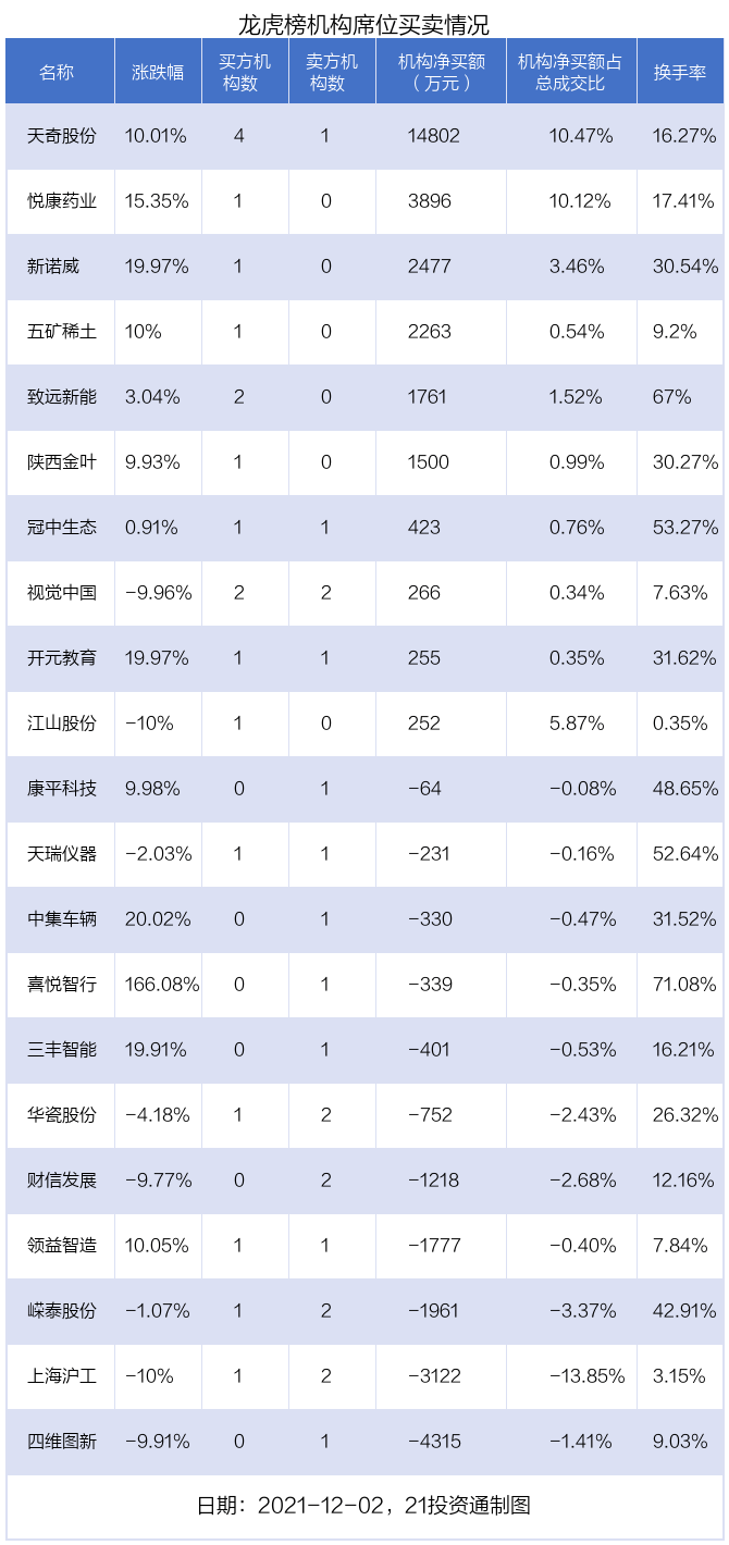 其中,机构千赢国际官网下载净买入金额最多的是天奇股份(002009.SZ),当日收盘上涨10.01%,换手率为16.27%。前五大买卖营业部中有5家机构,为合计净买入14802万元,占总成交金额的10.47%。