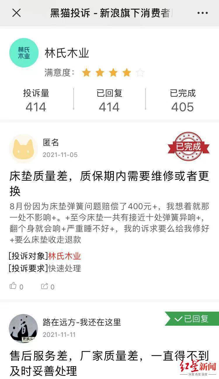 红星资本局从新浪旗下消费者服务平台“黑猫投诉”发现,消费者针对林氏木业的投诉数量已达400多条。其中大部分为产品质量问题,其次有售后服务差、家具异味很大等问题。