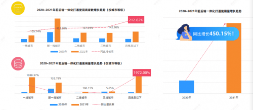 数据还显示,设计到生产的前后端一体化也呈现“下沉”趋势,四线及以下城市前后端打通使用量和使用企业数同比增长最多,分别为1972.00%和212.82%。