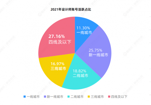 场景化设计体验方面,各区域设计师活跃度都有提升,其中下沉市场的设计师活跃度迎来爆发。四线及以下城市设计需求增多,市场容量释放,设计师账号活跃同比提升最多,2021年,四线及以下城市的设计师云设计工具账号的活跃度,占比总设计师云设计工具账号的活跃度已经升至第一,达到27.16%。