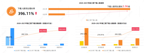 细分行业中,定制家具对施工图的数字化赋能较为得心应手,行业应用最深入。硬装建材和装修设计领域也在积极拥抱施工图,同比2020年,施工图下载次数增长402.96%和500.94%。从下载数量看,施工图在装修设计领域应用深入,使用人数同比增长453.72%。