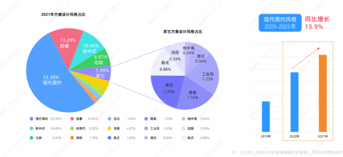 设计风格上,现代简约风在方案设会员BET9登陆计风格占比中持续攀升,轻奢风稳中有升,而日式风增长迅猛。其中,现代简约风的设计风格,已经占据方案设计风格总数的半壁江山,达到53.3%,同比增长15.9%。2020年刮起的轻奢风稳中有升,同比增长3.85%;日式风进一步“登堂入室”,越发受到市场欢迎,同比增长12.81%。