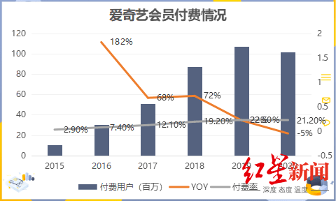 以爱奇艺(NASDAQ:IQ)为例,目前爱奇艺的月活跃用户数在6亿左右,难以再往上增长,用户规模触及天花板;从会员付费情况来看,据公司财报,2020年其付费会员数量已经出现负增长,自然付费率也难以再突破。