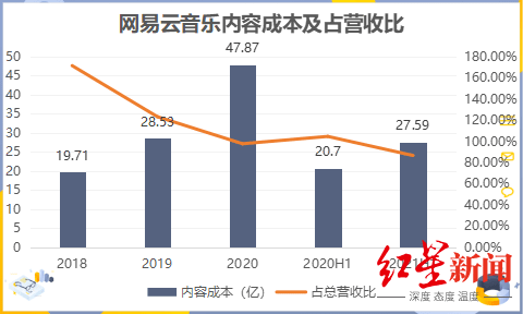 当然,版权背后的内容成本也很“贵”。招股书显示,2018年-2020年,网易云音乐的内容成本分别为19.71亿元、28.53亿元和47.87亿元。2018年和2019年,其内容成本分别是当年营收的1.7倍和1.2倍;2020年,内容成本占该年总营收的97.8%;2021年上半年,内容成本占总营收的比重也达到88.63%。