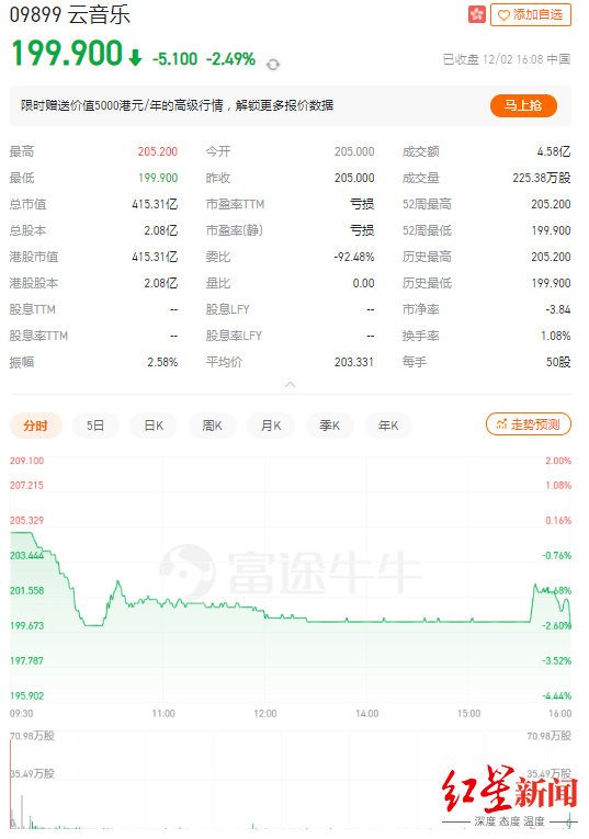 看得出,丁磊确实是一位热爱音乐的人。只不过,网易云音乐上市首日即破发。红星资本局注意到,截至12月2日收盘,网易云音乐跌2.49%,报199.90港元,总值约为415.31亿港元。