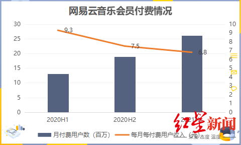 看上去很美好,2021年网易云音乐的会员付费率涨势喜人。但细究之后会发现,2020年上半年,网易云音乐每月每付费用户收入为9.3元;而2021年上半年,这个数字降至6.8元。也就是说,这样的付费用户增长,不少是受促销打折的短期刺激,并不能表现出自然增长的态势。