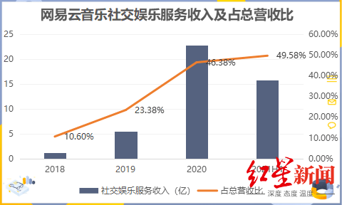 目前,网易云音乐的营收来源主要分为两大板块,一类是在线音乐服务收入,另一类为社交娱乐服务及其他收入。招股书显示,网易云音乐2018年社交娱乐服务及其他收入占总营收的比重仅为10.6%;而到了2021年上半年,该项收入占总营收的比重已达49.6%。两项收入目前对网易云音乐营收的贡献已基本持平。