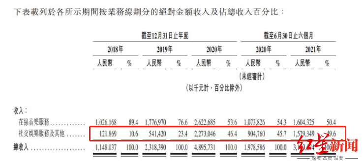 前文提及,近年来,网易云音乐的社交娱乐服务业务增速迅猛。招股书显示,2018年-2020年,网易云音乐“社交娱乐服务及其他”板块的营收分别为1.2亿元、5.4亿元、22.7亿元;2020年该项业务营收是2018年的18.6倍,2021年上半年,该项收入占总营收的比重已达49.6%。