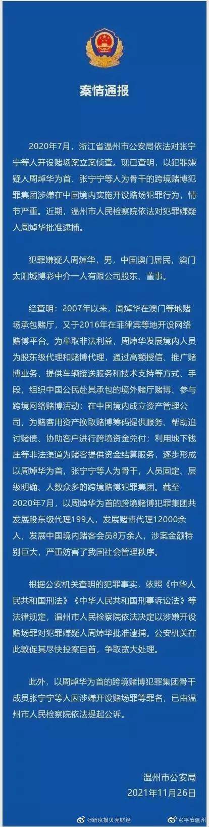 11月26日,温州市公安局发布案情通报称,以犯罪嫌疑人周焯华为首的跨境赌博犯罪集团涉嫌在中国境内实施开设赌场犯罪行为,情节严重。近期,温州市人民检察院依法对犯罪嫌疑人周焯华批准逮捕。通报同时督促周焯华尽快投案自首,争取宽大处理。